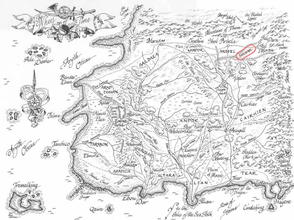 Shienar est l’une des quatre nations frontalières qui se situent aux abords de la Grande Corruption. C’est la nation la plus à l’est parmi les Frontières, se trouvant entre l’Échine du Monde et Arafel. Le blason de Shienar représente un faucon noir planant. Selon la tradition, le blason du souverain en place est également un symbole de Shienar.
